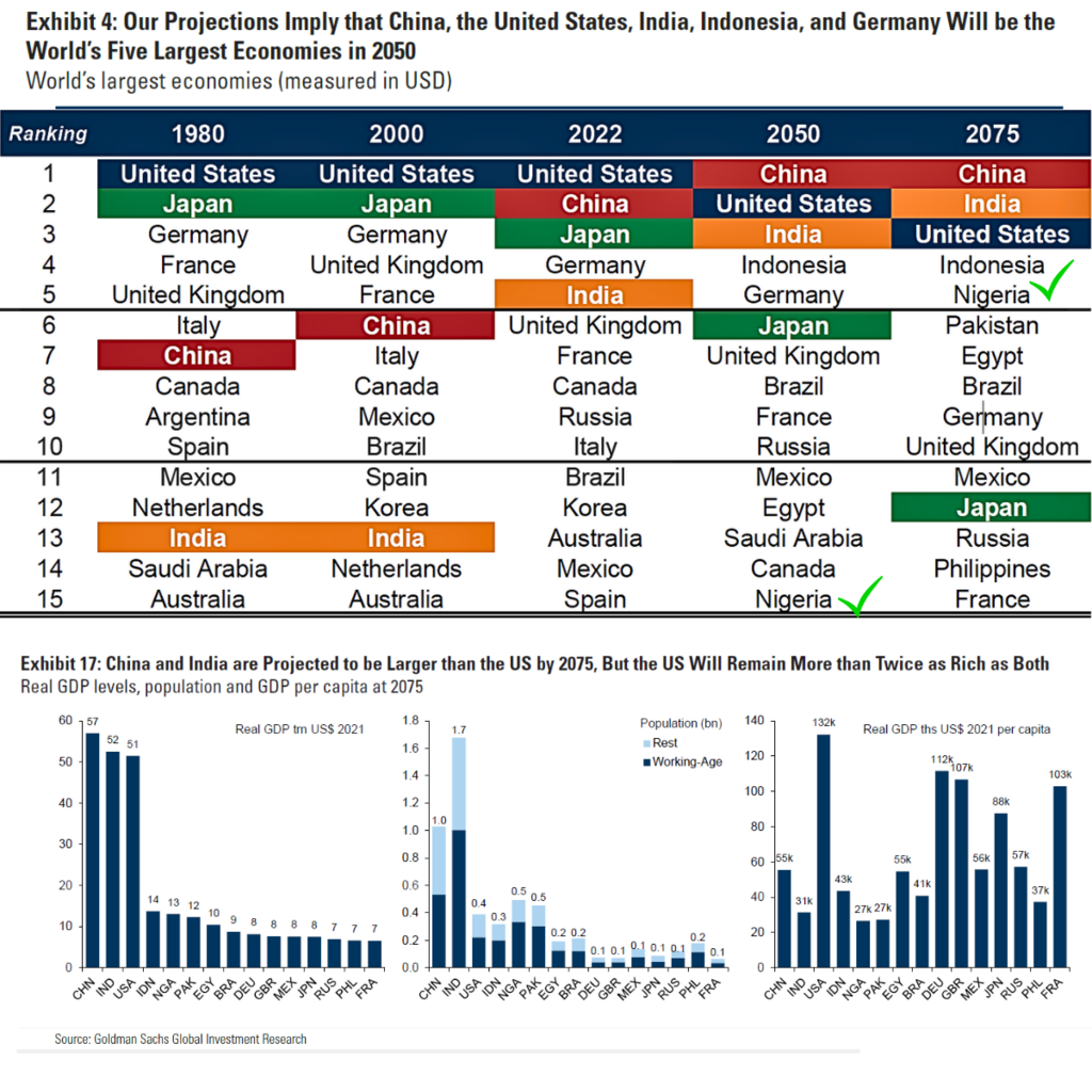 Nigeria will rank the 15th largest economy in the next 25 years, according to Goldman Sachs' projection. In another 25 years, leap to the 5th largest economy globally, growing at a steady 3.2% CAGR.